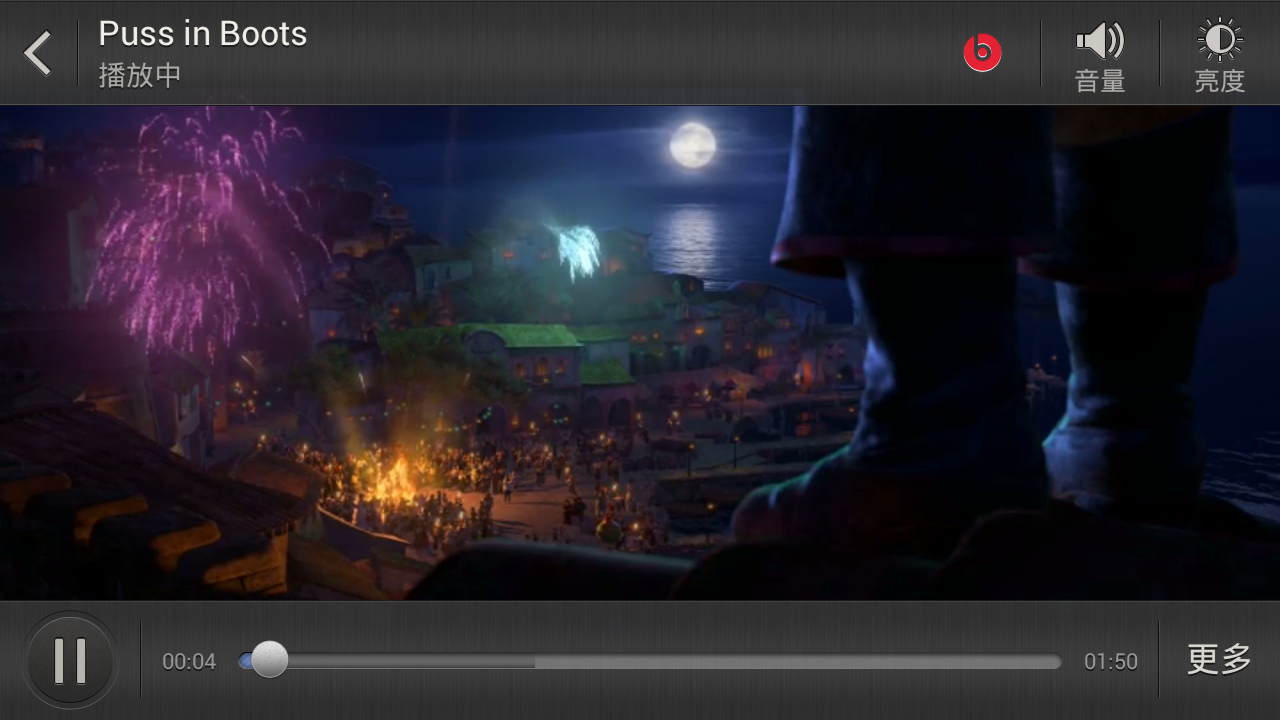 這是用HTC Watch所撥放的Puss in Boots預告片,可以看到右上方就有顆圓圓的Beats提醒你你已經開啟了Beats音效!