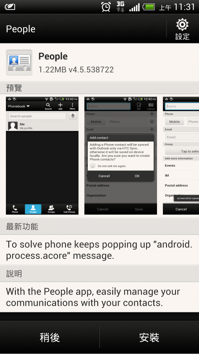 看來是修正聯絡人的功能 ,不過我點選下載安裝 目前似乎Server很忙 下載不下來