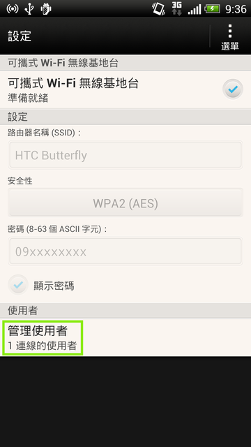 ▼當你的朋友開始使用你分享的網路時,你可以再點"設定"進去看看有幾位連線的使用者。