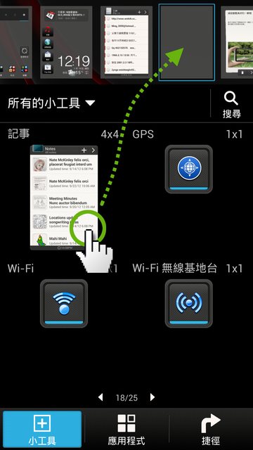小工具設定畫面分成上面七張桌面跟下方小工具列表,手指在畫面下方左右滑動就可以找到不同的小工具,先捲到第18頁吧!