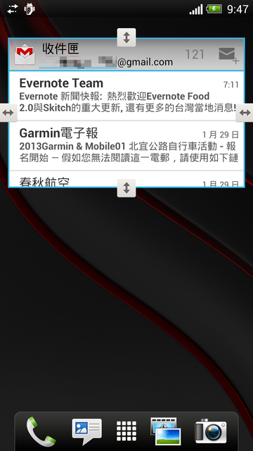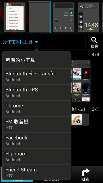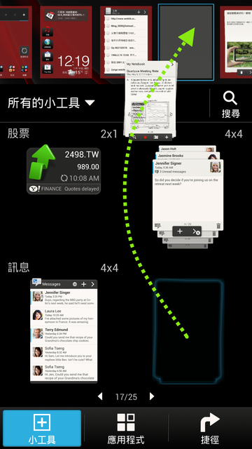 ▼其實小工具設定可以分成三大類,剛剛介紹的都是HTC自製的小工具,還有把應用程式拖到桌面的方法,這個跟程式集拖拉的方式是一樣的,不多說了。