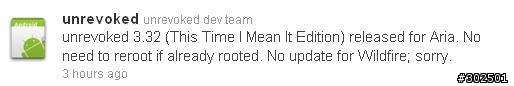 mess8888 wrote:剛剛看到unrevoked為Aria發布了新的版本(3.32) 自己回答一下...unrevoked 3.32測試Aria 2.2原廠ROM無法取得Root權限....已回報給unrevoked..再等等吧...