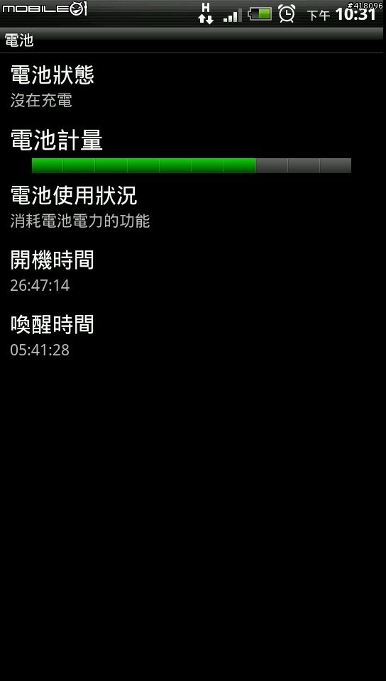 原來各位的電量那邊也都有類似破圖的情況還以為是我的手機有問題~~有人知道原因嗎?另外,我也去安裝了前面推薦的Battery Mix,不過都是英文,是否有類似的軟體但是是中文的呢?(小弟英文不好~Orz)因為女友說,他晚上衝到100%,早上起床都剩1X%,有時甚至會關機,必須要插充電器才能開機,所以想說來裝個電量監控軟體,來看看是哪個程式或者是原因造成的。麻煩各位了^^
