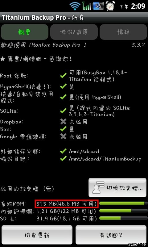 請問各位大大,照片內系統ROM的地方,可用空間是不是有點問題?正常數字應該是多少呢?因為最近感覺到手機有點頓,開網頁或下載app常常當機,一直搞不懂是什麼原因,今天才去看到系統可用只有46MB,會不會是這個原因造成手機變慢...><(P.S.重刷只要用鈦備份就都會回來了嗎?因為沒有重刷過)