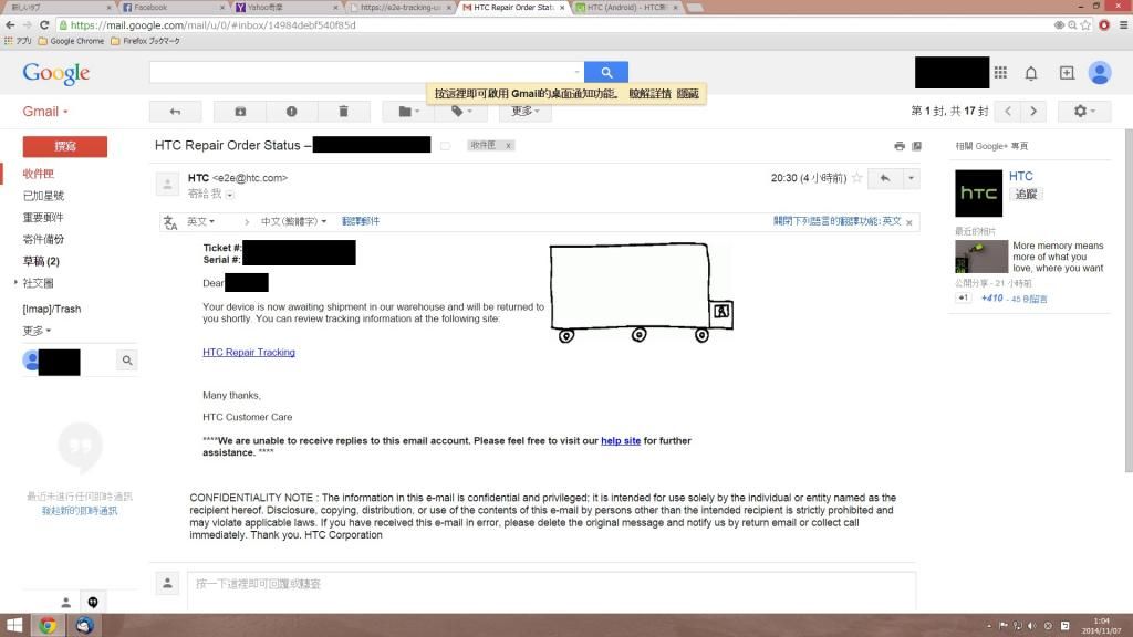 (大概是11號時有寄回來,但馬上又有問題,隔兩天就又寄回去了)