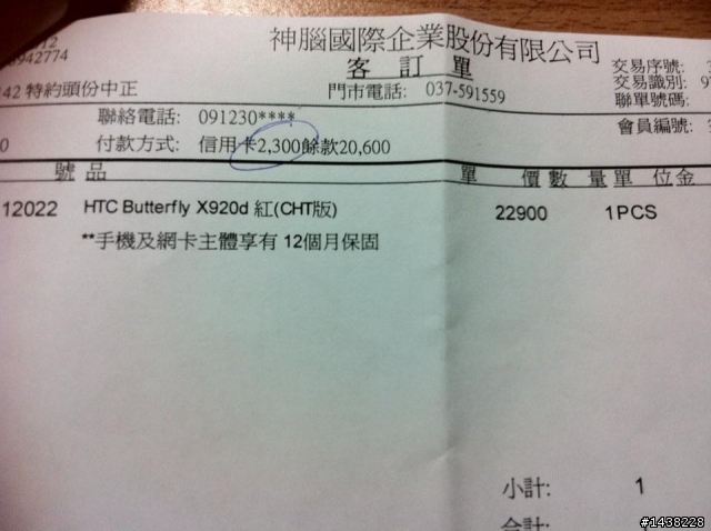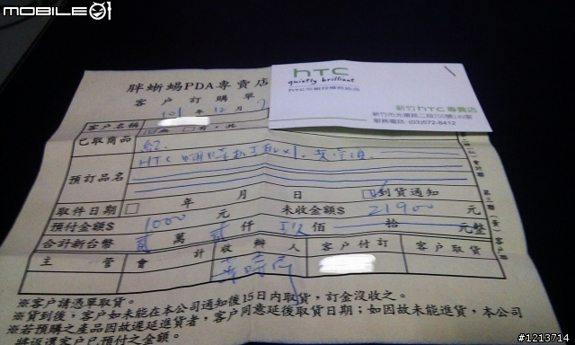為了原廠皮套,打電話問了數家HTC官網上所謂的"專賣店",看來桃園地區的這一家的預購禮較好,送12000mAh移動電源,還有"收納袋"??馬上付1000元訂白色一支, 我是該店BUTTERFLY預購第24號.原本也要幫二位同事預購,但店員表示中華電信續約購機只能到神腦,所以作罷.填完單子,不到一分鐘,又有人來預購,生意真好.