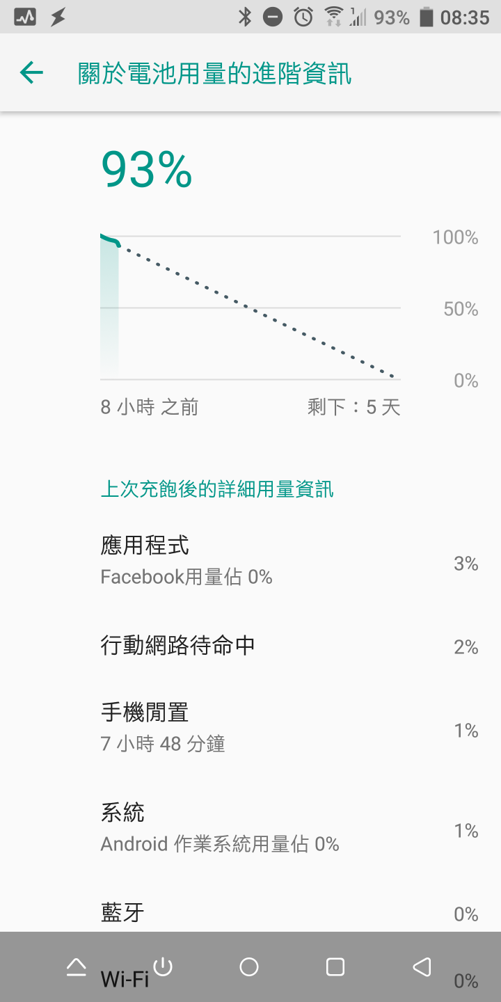 附上圖,啥事都沒幹,沒裝新app(目前有一百多的app),沒有關任何GPS、飛航模式、網路,沒有裝什麼省電Tool只有在睡前充飽電重開機一次,然後窩在被窩玩一下FB、youtube、PTT,8小時醒來還有96%,繼續窩在被窩滑手機截圖時還有93%我真的搞不懂這隻手機...今天又莫名其妙省電。
