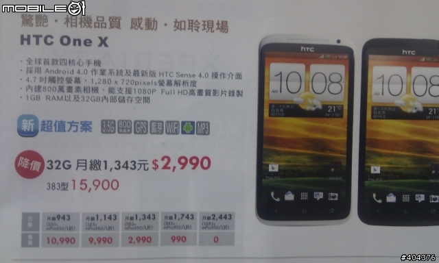 哇!中華(新超值二年約)月繳1343,若ONE X+ 手機只要2990,那就真的是佛心來著耶!!!但是為何從emonme 網站上和神腦的DM所看到的2999元的手機只有Sony Xperia TX (LT29i)和 HTC ONE X (32G)連Samsung Galaxy Note II (N7100) 16G 都要14999元就是沒看到hTC ONE X+的方案