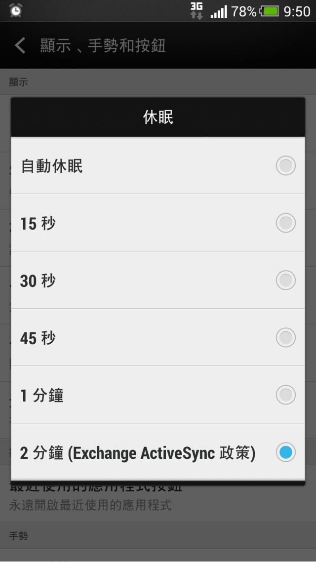 請問一下為什麼我的蝴蝶s無法設2分鐘及10分鐘的休眠時間?我最多只能設1分鐘,那個Exchange ActiveSync政策是幹嘛的?我都把Exchange ActiveSync帳號刪掉了也是無解...