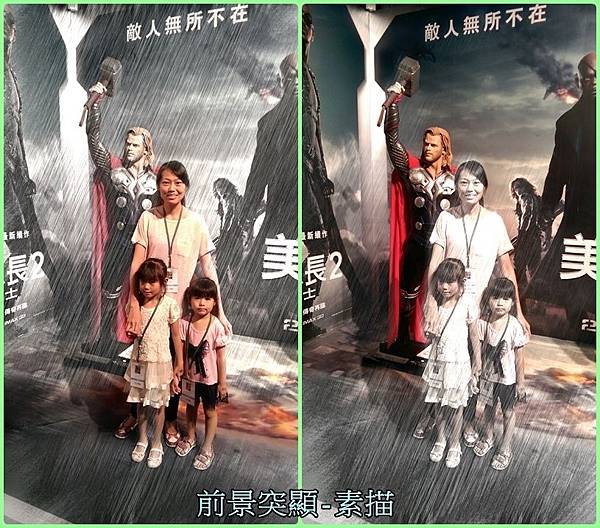 前景突顯的素描效果如果點選背景看起來整幅圖片還算完美,如果點在自己身上......瞬間我笑了!怎麼我們好像是無意間亂入的東西,還好不是在農曆7月啦~哈,我和孩子們笑好久,真的是親子間娛樂效果十足哩!