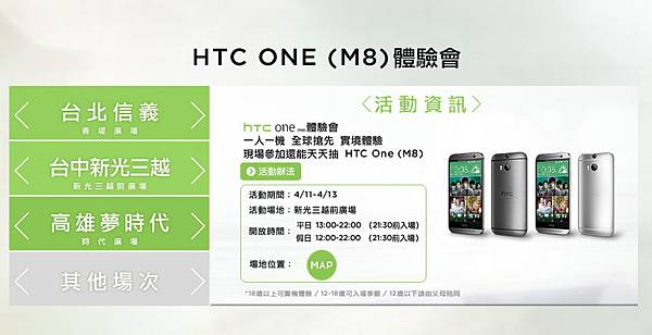 HTC 官網公佈的 HTC ONE M8 北中南體驗會時間以及體驗地點,高雄場將在這個周末展開上巿體驗會喔!