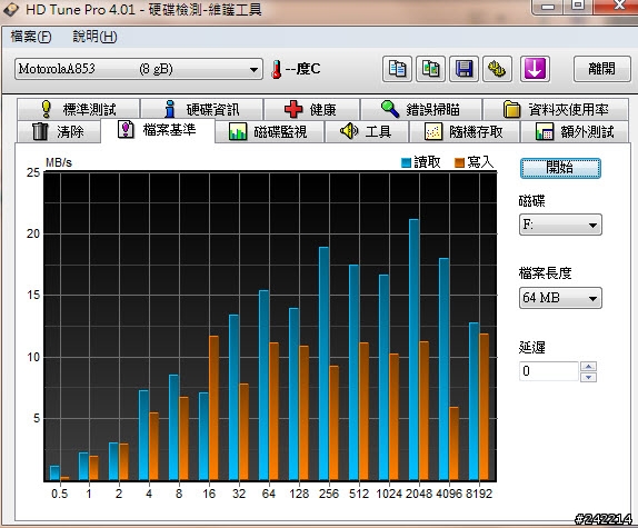 最近覺得我的milestone可能因為記憶卡的問題有些頓剛剛在無聊下拿了我的t-flash做測試發現似乎有些問題系統是Xp使用有安裝moto driver和RSD 我用原場的usb線這是我用20R10W的8G T-flash的測試圖Atto也差不多是4W8R ~~看來是效能卡住~有人能一起測看看嗎?以下是19R7W的16G t-flash的測試圖Atto是3.5W8.5R左右~