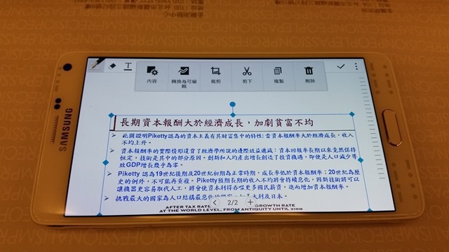 如果想將投影片或路上看到內容直接轉為文字,好做筆記或傳給朋友的話,我就利用智慧選取功能,擷取需要的區域,Note 4就會自動幫忙轉成文字了。