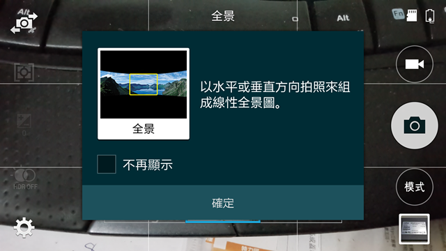 跟環繞拍攝模式相比,拍攝水平或垂直方向一定範圍照片的全景模式,相對就簡單多了,只要在拍攝時,依指示拍攝,就能拍出成功的全景照片。
