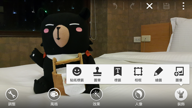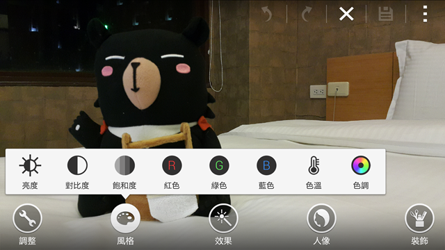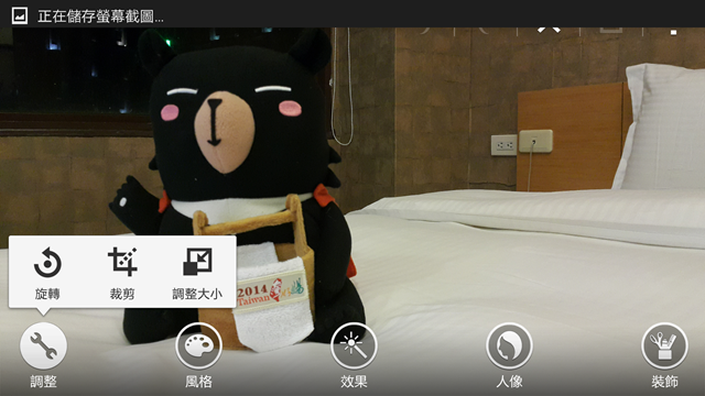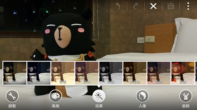 照片拍完後,Note 4也提供調整、風格、效果、人像與裝飾五種後製選項,讓我可以對拍好的照片進行調整,或是加上有趣的元素。
