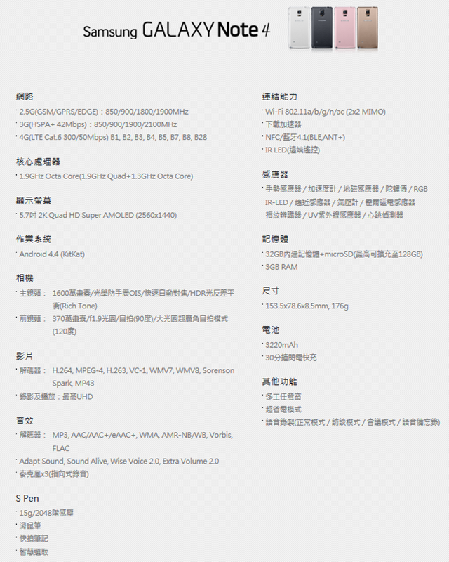 根據喔熊的體驗心得,我得到的結論就是,各位如果常需要寫筆記或記錄資訊,又需要有好的照相功能,還需要大螢幕與強勁硬體規格的手機,在預算足夠下,Galaxy Note 4是值得考慮入手的手機哦!最後,附上官網的硬體規格表給各位參考吧…Bye…Bye