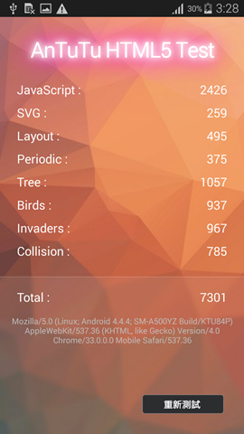 定位中階機種的Galaxy A5,使用了高通驍龍410 1.2GHz 四核心處理器。趁著體驗機會,使用安兔兔做些簡單測試,讓有興趣的大大對它效能有些參考資訊。