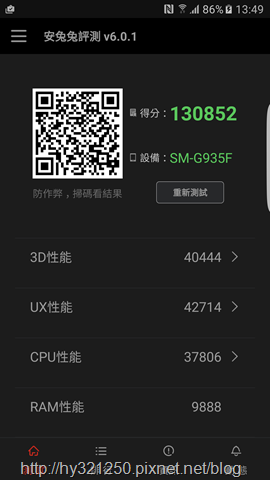 使用安兔兔測試一下手上這支S7 Edge的效能,最後測得的總分是130852。