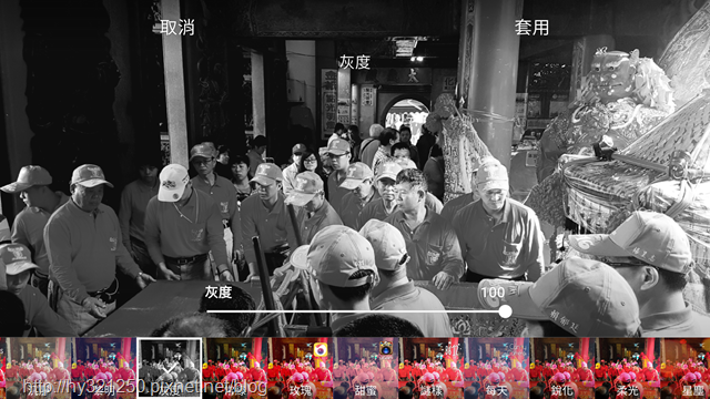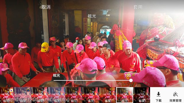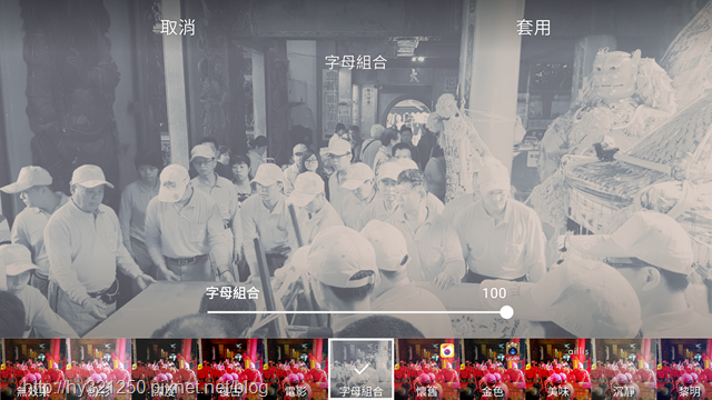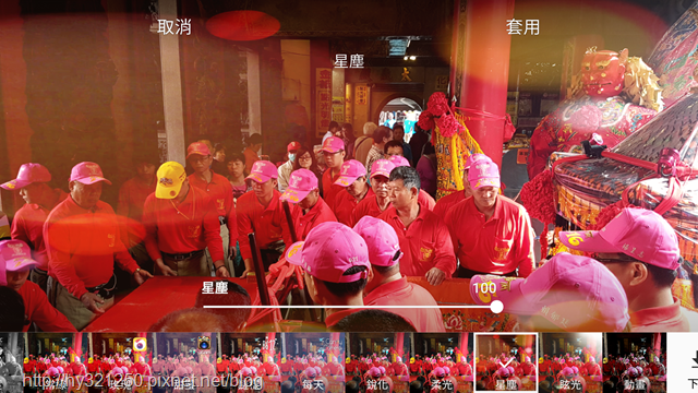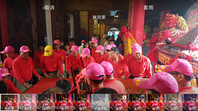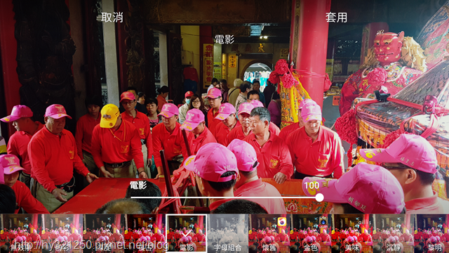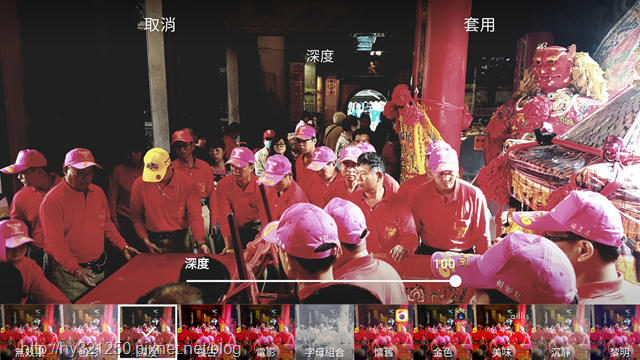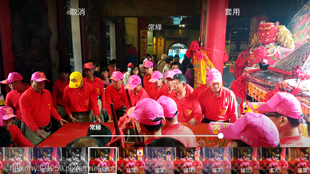 預設拍照效果部分,總共有8種可供選擇。而這些拍照效果,還可以再各自調整強度與暗角比例。以下,是這八種預設拍照效果與原始無效果的實拍照片,可以做對比參考。