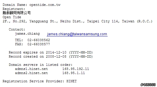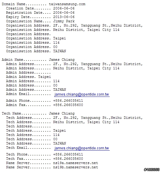 有大大查網址申請,月月鳥泰網址跟台灣三星關係。http://whois.domaintools.com/taiwansamsung.comhttp://whois.domaintools.com/opentide.com.tw
