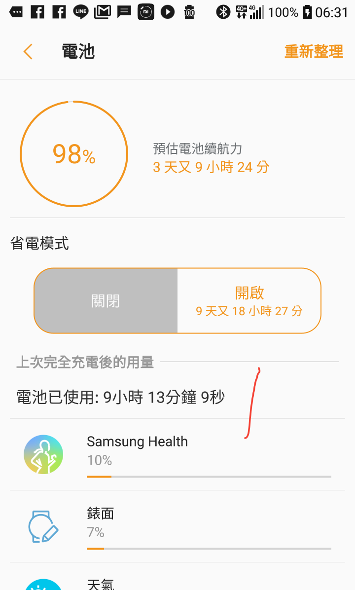有沒有用 samsung pay我的是 46mm 在還沒設定 samsung pay之前 一晚上只會耗3~4%, 設定完之後一晚上就不見了10%,我重置了好多次才發現是 samsung pay的問題,今天早上試者讓nfc也開著,感覺又比較不耗電一點,但是我還不確定,明天早上再看看會不會比昨晚省電一點,你可以重置看看,之後不要設定samsung pay和更新高度計還鬧鐘還有samsung flow保持剛重置完再看看耗電,我之前這樣是最省電了,現在設定完samsung pay耗電多一倍以上,所以覺得是samsung pay造成的,而且在耗電看不出來samsung pay會吃電