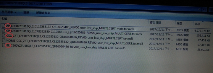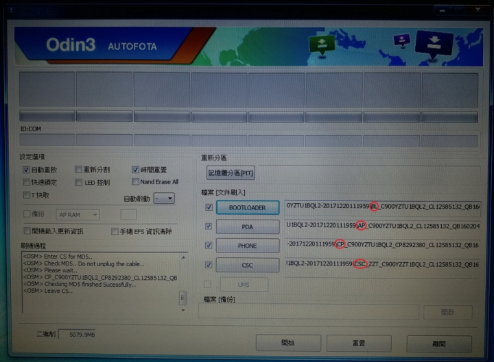 然後將下載好解壓縮完的ROM包其資料夾內的5個檔案,依照圖片將檔案丟入Odin3對應刷入的位置,開始進行刷機。(CSC位置可丟入資料夾內的HOME_CSC或CSC檔案,2選1)