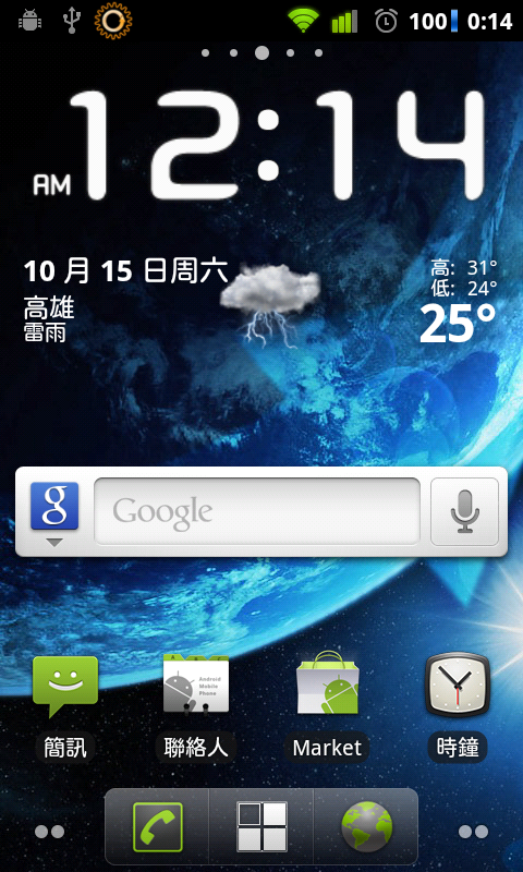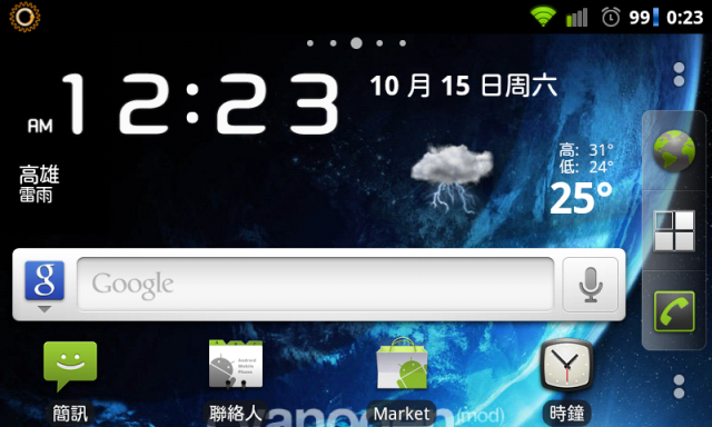 這個版本在純待機很省電,用在上網及更新gmail,facebookc耗電量還能接受,但是用在玩遊戲會噴很大系統介面繁中,但沒有中文輸入法,可安裝HTC中文輸入法夜夜更新版要用 ROM Manager Premium 最新版v4.5.0.1才能刷照相機操作介面跟HTC一樣鳥鳥的內建3個主題桌面,支援Market下載ADWTheme主題桌面