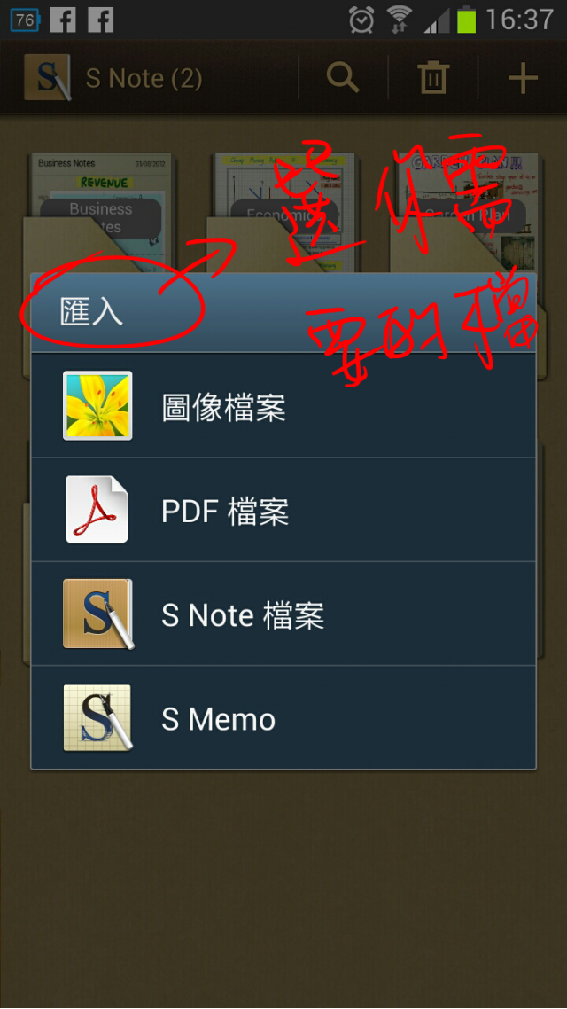 david_chou wrote:小弟目前使用Note...(恕刪) 小弟是使用NOTE2不過應該大同小異吧很簡單的開啟S-NOTE後左下角的功能鍵(選單鈕-在最下方實體按鍵的旁邊)選擇匯入,就可以了(可以匯入圖檔 PDF S-NOTE檔案 S-MEMO)在選你想放的檔案案右上角確認完成匯入後就發現有你想要的背景了