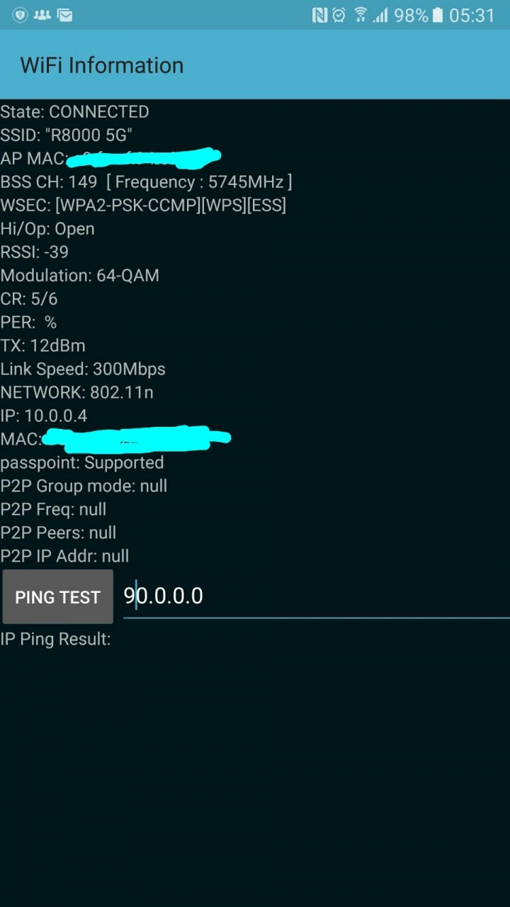 4.可以看到wifi的資訊,重點在Mudolation只能使用64QAM,Network也只有連到802.11n,未更新前是可以跑256QAM的,note5有雙天線,如果ap也有兩根天線以上,正常來說可以跑到866Mbps,可是現在最多只能跑到300Mbps了。