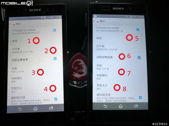 凱CAI wrote:左邊是我閃光的 右邊是我的 我對白色的政治正確是我自己的Z1阿~~~然後被手機行酸說我手機問題比較大 左邊是亮黃 右邊是白色不是嗎QQ還是我色盲 我不知道照片中的顏色和你實際看到的螢幕顏色差多少但如果就照片來說,右邊那台確實偏藍喔至於左邊...應該會有不少人覺得偏黃但其實它沒有明顯偏向哪個色調用工具來確認↓首先把兩台螢幕各選4個區域,分別標上編號1~8號再用小畫家的「色彩選擇器」,在每個區域大約中心的位置選取顏色然後點選「編輯色彩」觀看這8個顏色的色彩資料包括:在色彩座標上的位置、色調、濃度(即飽和度,越濃越鮮豔飽和,越淡則約接近灰色白色)、亮度,以及RGB三色的數值比例詳細資料截圖如下:為了方便比較,我把1~8號顏色放在上面那一列並在這8個顏色下面放了相同亮度的灰色,做為對照這樣比較一下,應該就很明顯了