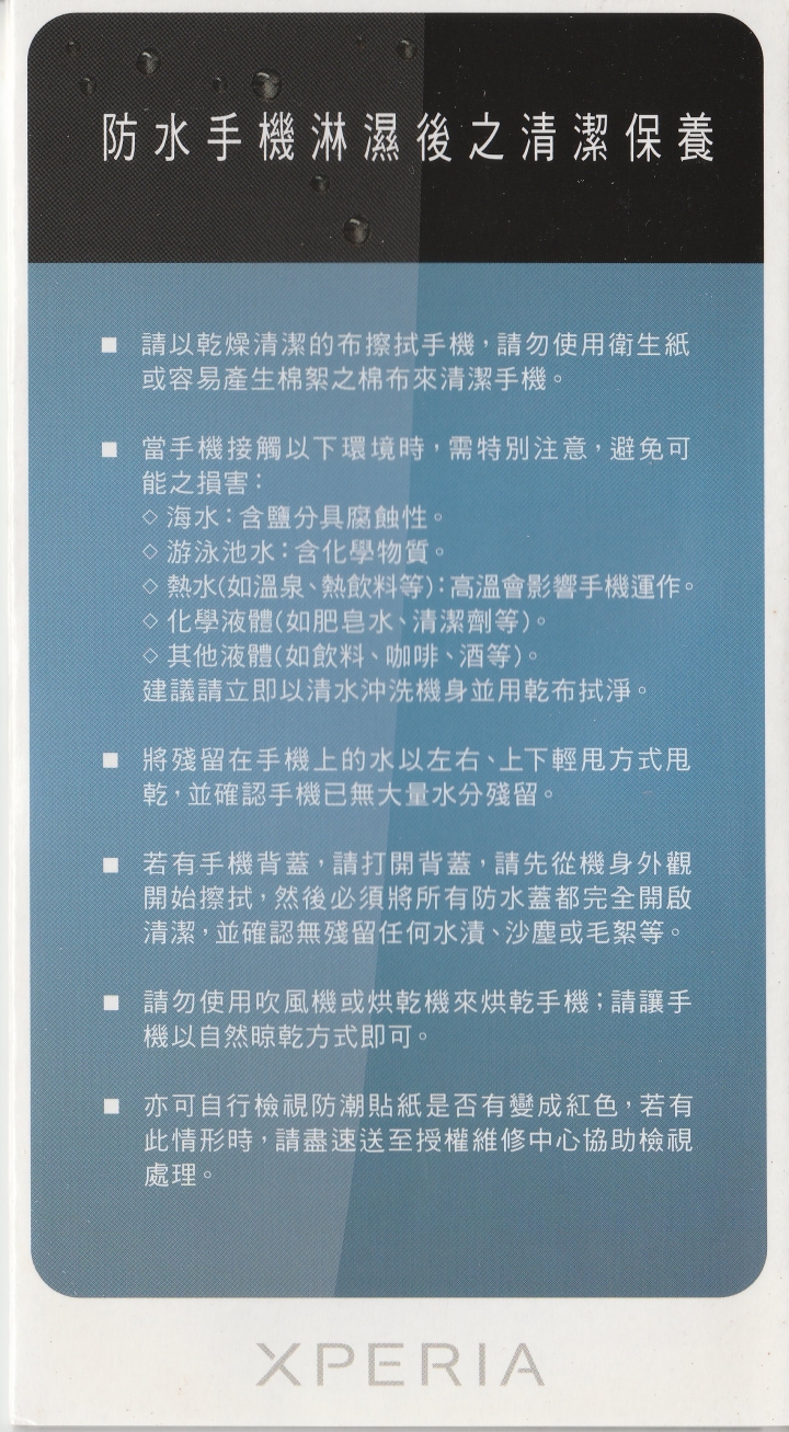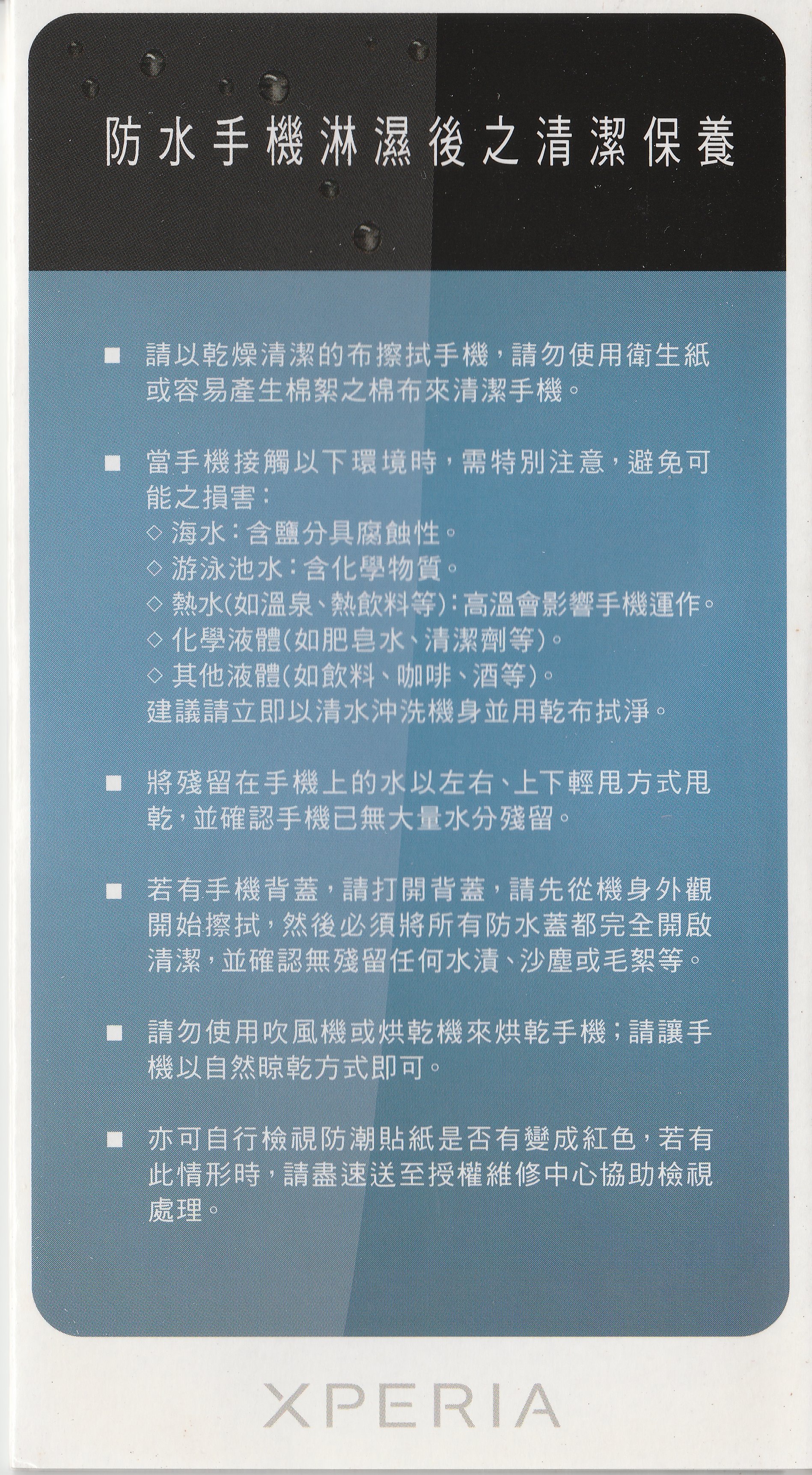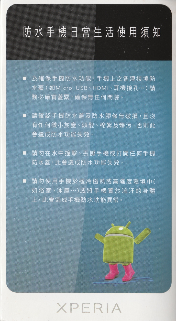 我的Z2手機,除了有時雨天在戶外不得不使用時,頂多是用水清洗整個外表.所以他的防水我可以接受我的SW2手錶,有時洗澡忘了拿下來,或是戴著洗手,也都沒有出現異狀.所以他的防水我可以接受我的RX100II相機,曾經在湯澤冰天雪地中使用,即使上面的雪花融化成水,整台相機弄濕了,依然可以使用.所以他沒有防水我可以接受我的防水藍芽耳機,目前還沒有戴著去游泳過,所以他的防水我還不知道可不可以接受我的防水藍芽球型喇叭,目前還沒有拿去浴室播放過,所以他的防水我還不知道可不可以接受防水對我來說,是預防勝於常態在水中環境使用