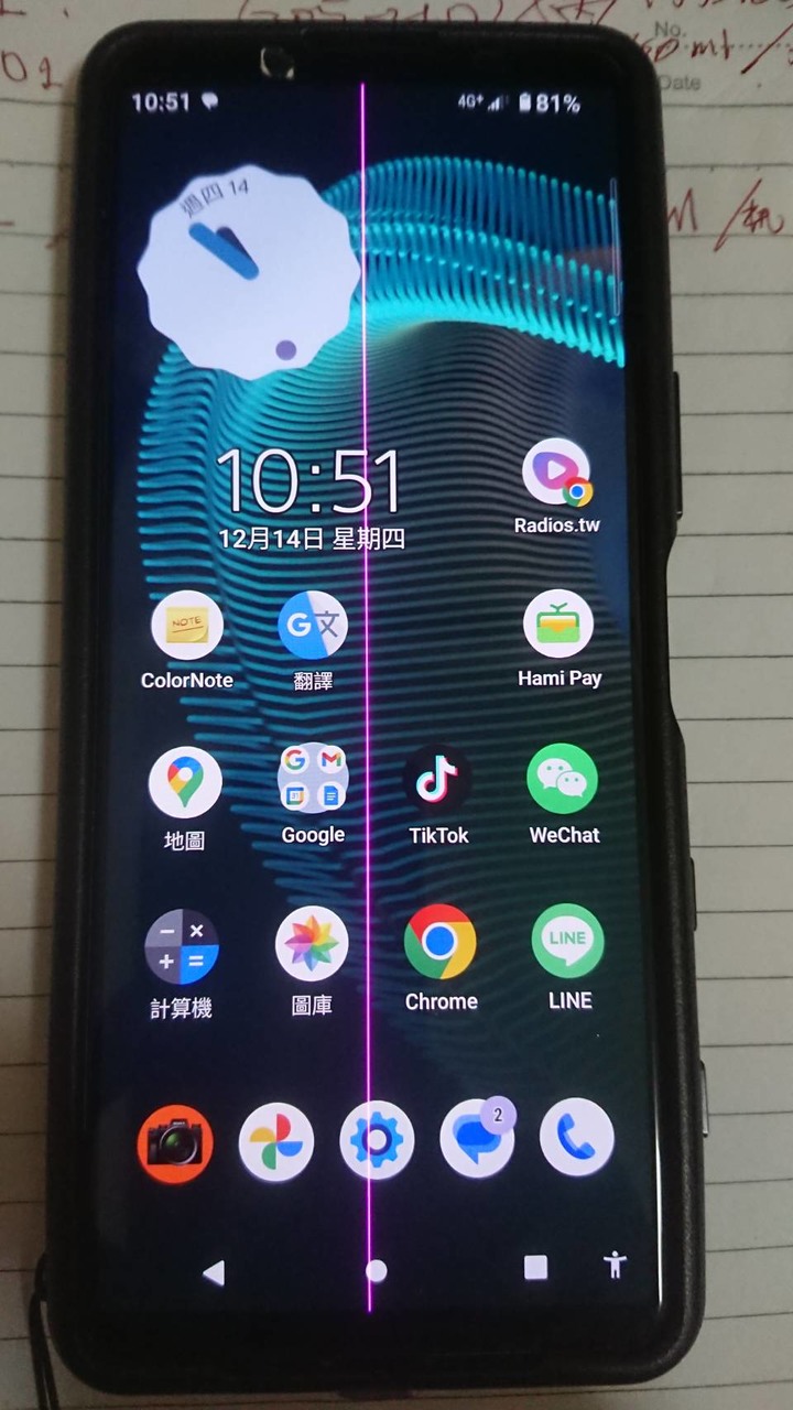 昨晚放著充電,早上看到正中間出現一條紅線。。。XXOO..-------------------------------------------------------------------------------------------------------------快滿一年了,現在變這樣...