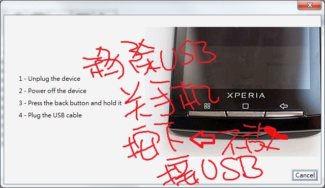 先把手機移除USB⇒關閉手機⇒按下返回(ARC和X10位置剛好相反)不要放開⇒將USB接上