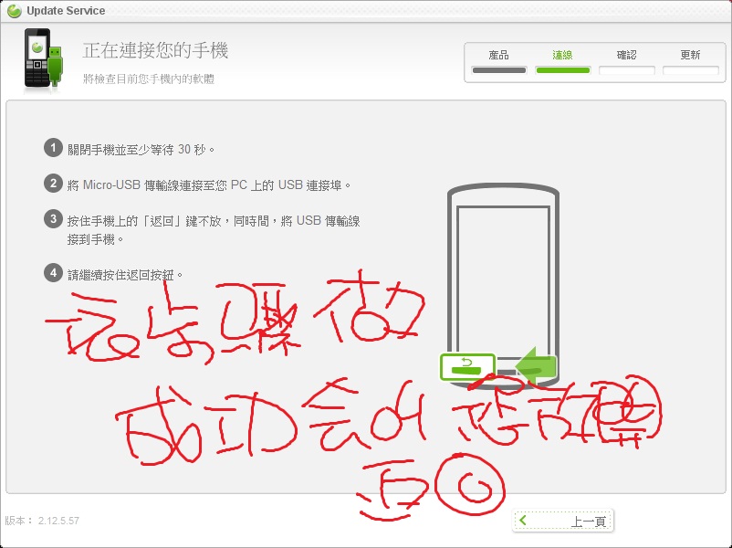 依照步驟關機⇒移除USB(建議是接手機端將電腦端拔除)⇒按下返回鍵不放⇒連接USB至電腦⇒沒意外會亮LED燈,