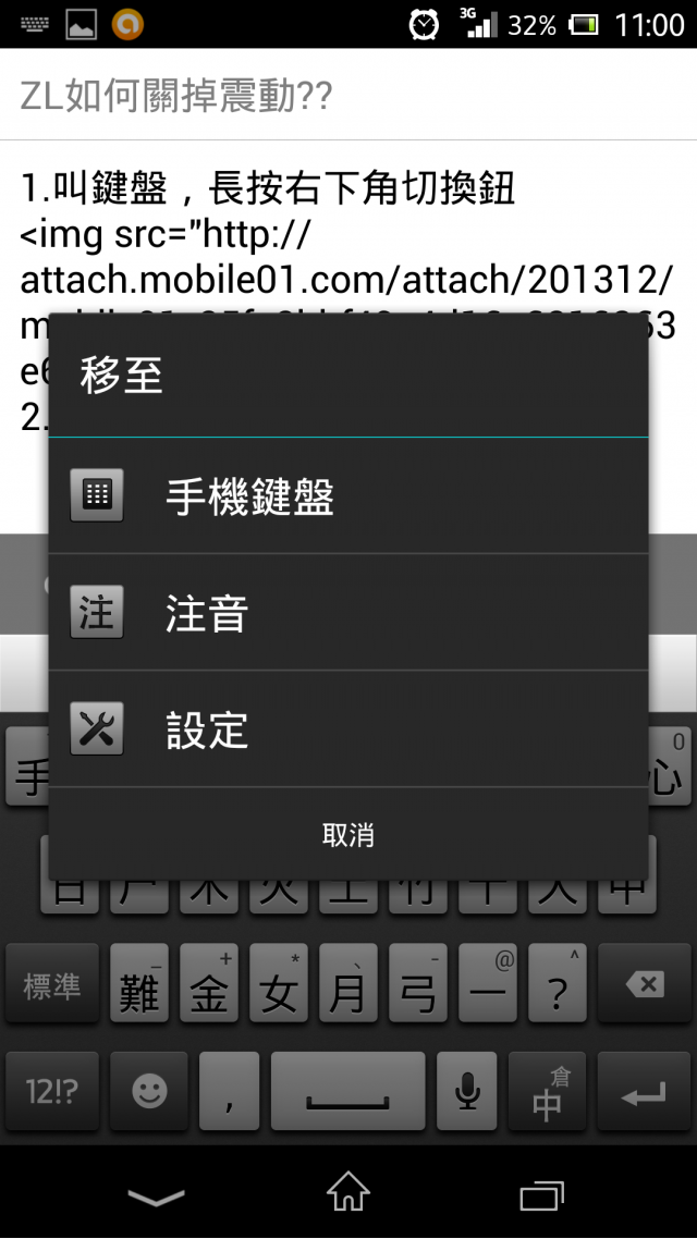 perseus5655 wrote:⒈設定/語言與輸入裝...(恕刪) 大盜守望者 wrote:建議大大可至手機的設...(恕刪) elsa20216 wrote:1.叫鍵盤,長按右下...(恕刪) 感謝幾位的解答.打字震動已關掉.開關機如是預設的就無解了!感謝!