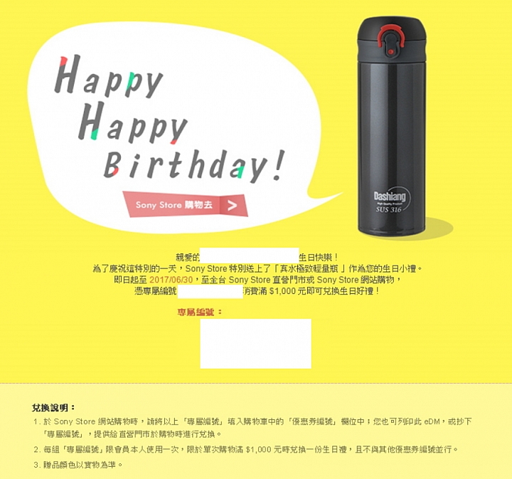 剛剛收到領取生日禮物的簡訊囉,找時間去換好再跟大家回報生日禮囉親愛的Xperia VIP會員,在這個屬於您的月份,Sony Mobile特別準備VIP尊榮生日禮與NT$1,000購機折價優惠,請憑簡訊的專屬序號至全台Sony Mobile行動通訊專賣店領取(不包含Sony直營店)。優惠到7/31為止,邀請您盡速到店兌換。
