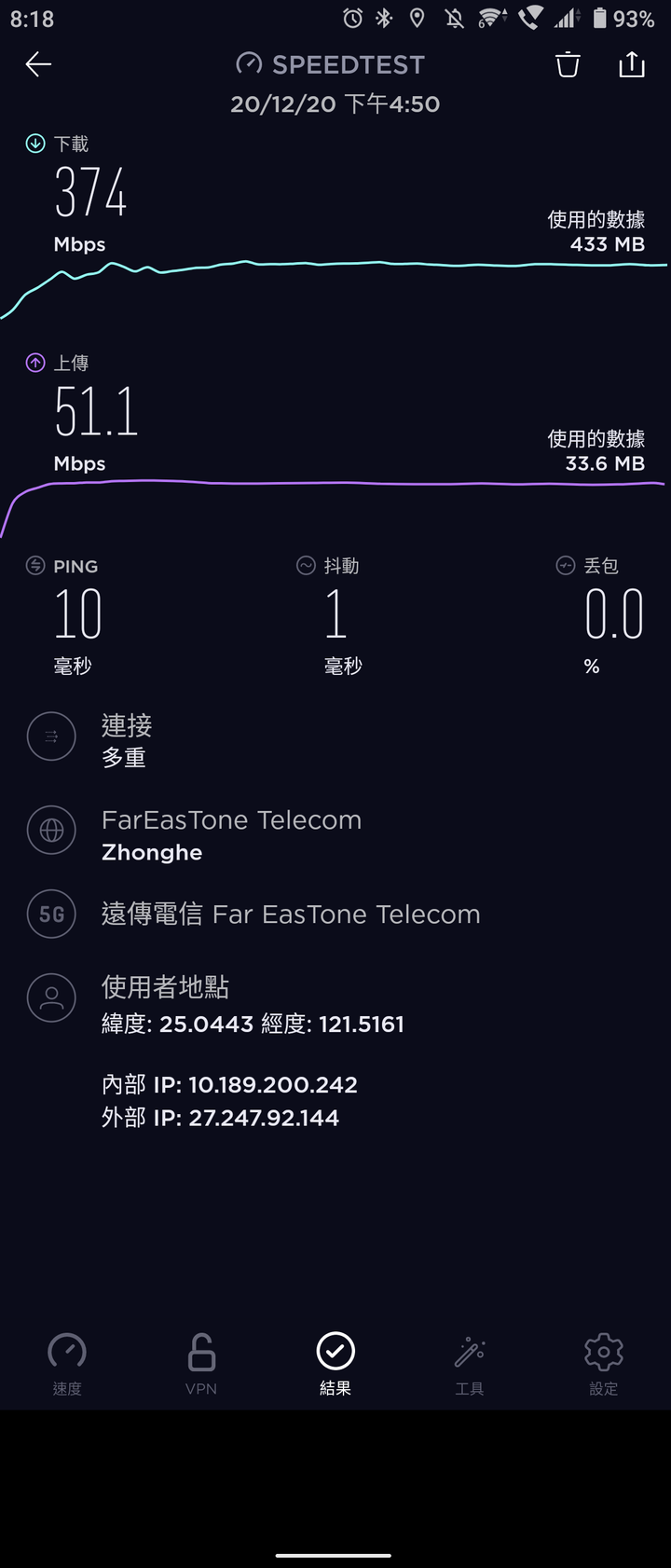升到Android 11之後,使用起來很穩定,當然如果電信業者的訊號不好的時候那跟手機無關,這張是前兩天我在台北車站測試的速度比我合約速度還快上將近一倍這個是我平常在逢甲附近測試的速度,用起來也還是比4G快上不少