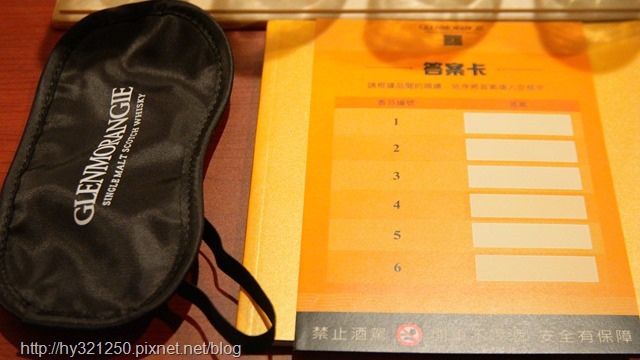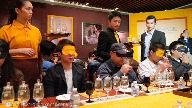 在正式進入品酒之前,Brendan為了讓在場所有人更了解格蘭傑威士忌的主要香味,讓隨後的品酒更有感覺,因此也把在蘇格蘭酒廠才能體驗的整套品酒流程,原封不動在現場讓大家體驗。所以,首先進行了蒙眼解密的活動,讓大家戴上眼罩,靠嗅覺分辨服務人員托盤裡的六個品飲杯內的香氣各自為何?