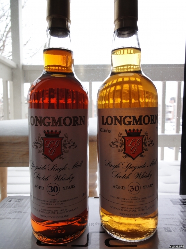 請問一下, 我在兩個地方買的longmorn 30,發現兩瓶顏色不太一樣, 這是怎麼回事? 買到假酒嗎?我這邊美國酒專賣店, 很大間, 又很專業, 應該不太會賣假酒.左邊在英國網路上買的, 右邊是美國酒專買的.