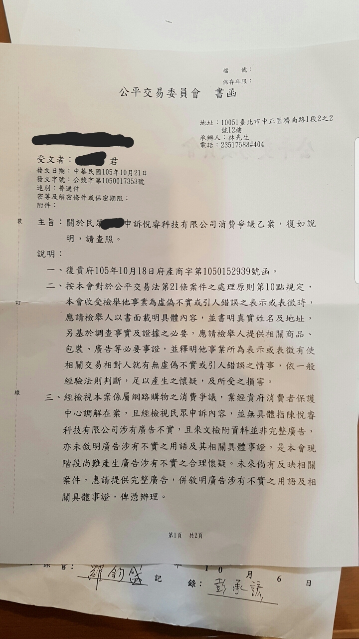 2. 消保官將該案行文公平交易委員會,我於 10月21日收到回函,如附件(公平交易委員會回函.jpg )所示。