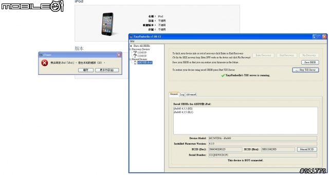 不好意思~借版問一下小弟也想升4.3.3(目前版本4.2),只是現在有個問題小弟之前用iFunBox丟影片到OPLAYER資料夾裡,但是手殘丟錯資料夾(丟到IPT的相簿裡)現在開啟相簿時,都會顯示1個視訊,但是卻找不到,在iFunBox裡搜尋有搜到,卻刪不掉於是想要回覆在JB,但回復卻要強制更新韌體至4.3.5,所以想請問神人們,請問升到4.3.5還可以降版至4.3.3在JB嗎??