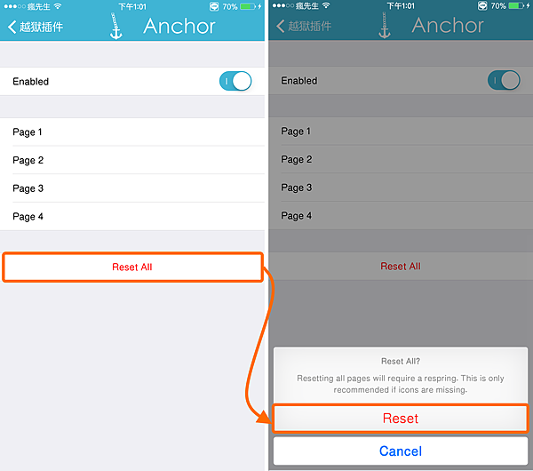 myavpenguin wrote:Anchor 似乎B...(恕刪) 空白Bug問題還需要等作者修正問題,瘋先生已經做出教學文章及暫時應對空白Bug的解決方式,參考如下http://mrmad.pixnet.net/blog/post/193222623Anchor 空白BUG 解決方法Step 1. ▼ 此插件初版會有個刪除APP的BUG,只要刪除APP後重開機就會造成主畫面空白現象,對於此問題暫時有個解決方法,但還是需要靠作者推出修正版才能真正解決問題。解決方法主畫面往下拉動,尋找「設定」。Step 2. ▼ 再找到「Anchor」設定,點選一下「Reset All」來將全部版面還原,(右圖)會在跳出一次確認是否真的要還原?點「Reset」即可,這樣該問題就可能暫時解決。