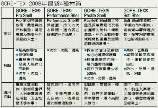 Gore-tex就少了裏布耐磨的部份(兩層材質複合),可以對應之前的Performance Shell,