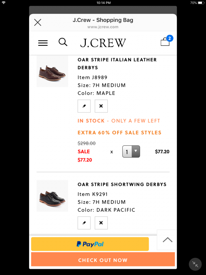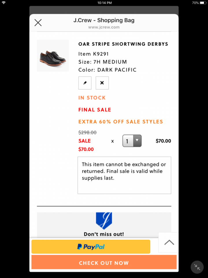 Jcrew sale on sale 額外60%折扣碼. 有幾雙鞋似乎不錯 有需要請把握. 折扣碼 LASTCHANCE.