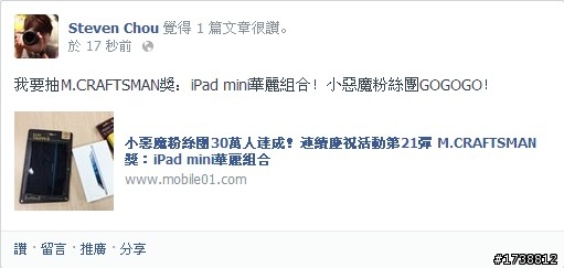 我要抽M.CRAFTSMAN獎:iPad mini華麗組合!小惡魔粉絲團GOGOGO!