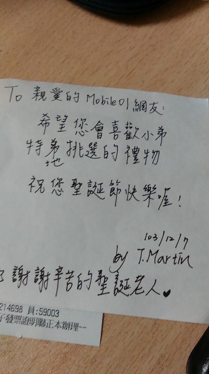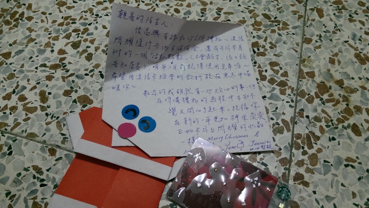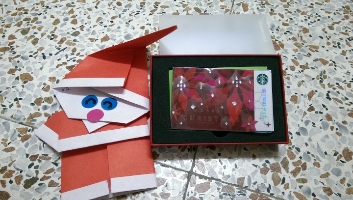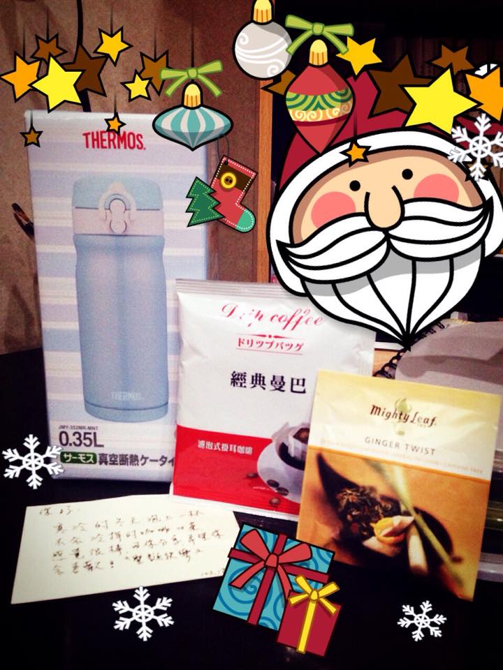 這是第一次參加,好開勳,好期待星期日下午才打開了包裝裡面是一隻聖誕老公公 & 亮晶晶的星巴克耶誕隨行卡(這張卡竟然要價500XD)但比較好玩的是這隻聖誕老公公,裡面竟然寫了好多字,這比收到禮物更感動脫掉老公公的帽子後再來解開他的上面扣子XD再來趴開脫光他~感謝台北的Jeannie,希望新的一年能擺脫你所正煩心的事情~我的禮物不知道是誰收到了呢?希望適合有緣的你