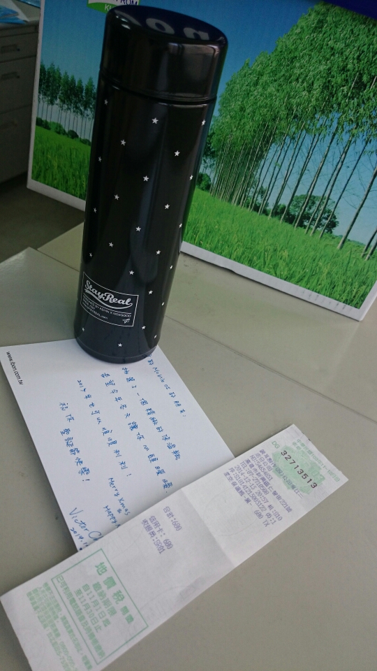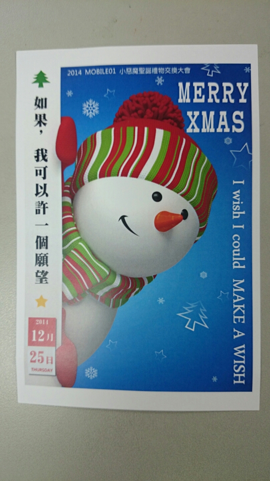 我也收到囉~第一屆收到象印保溫杯第二屆是海賊王的餅干第三屆又回到保溫杯了 而且是stayreal的耶是五月天迷來著的嗎 XDDD我很喜歡唷~謝謝來自高雄的Victor卡片是自己設計的耶,上面還寫著「2014mobile01小惡魔聖誕禮物交換大會」很用心!thank u so much~我送出的是moor藍芽耳機,好像還沒看到開箱欸