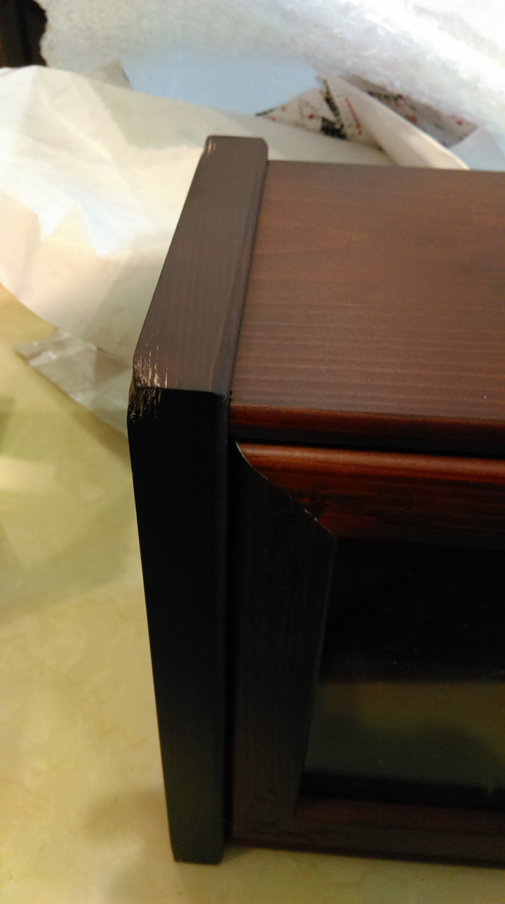 第一次 參加交換禮物~ 收到的禮物是一個Working House的木頭櫃子~但是 可能在運送過程中 撞壞了~試著拿去Working House, 想換一個新的~店員 一直跳針~ 問說"當初取獲時 沒有檢查嘛?" "當初取獲時 沒有檢查嘛?" "當初取獲時 沒有檢查嘛?" "當初取獲時 沒有檢查嘛?".....最後就是不給換~懷疑是撞傷的角角~正面的玻璃面 壞掉了~ 固定玻璃的木頭 裂開了~老婆這次也一起參加交換禮物~拿到的是32G的micro SD卡~