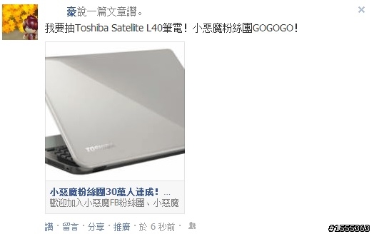 「我要抽Toshiba Satellite L40筆電!小惡魔粉絲團GOGOGO!」