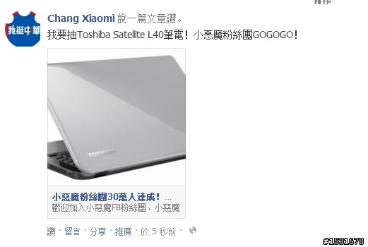 「我要抽Toshiba Satellite L40筆電!小惡魔粉絲團GOGOGO!」